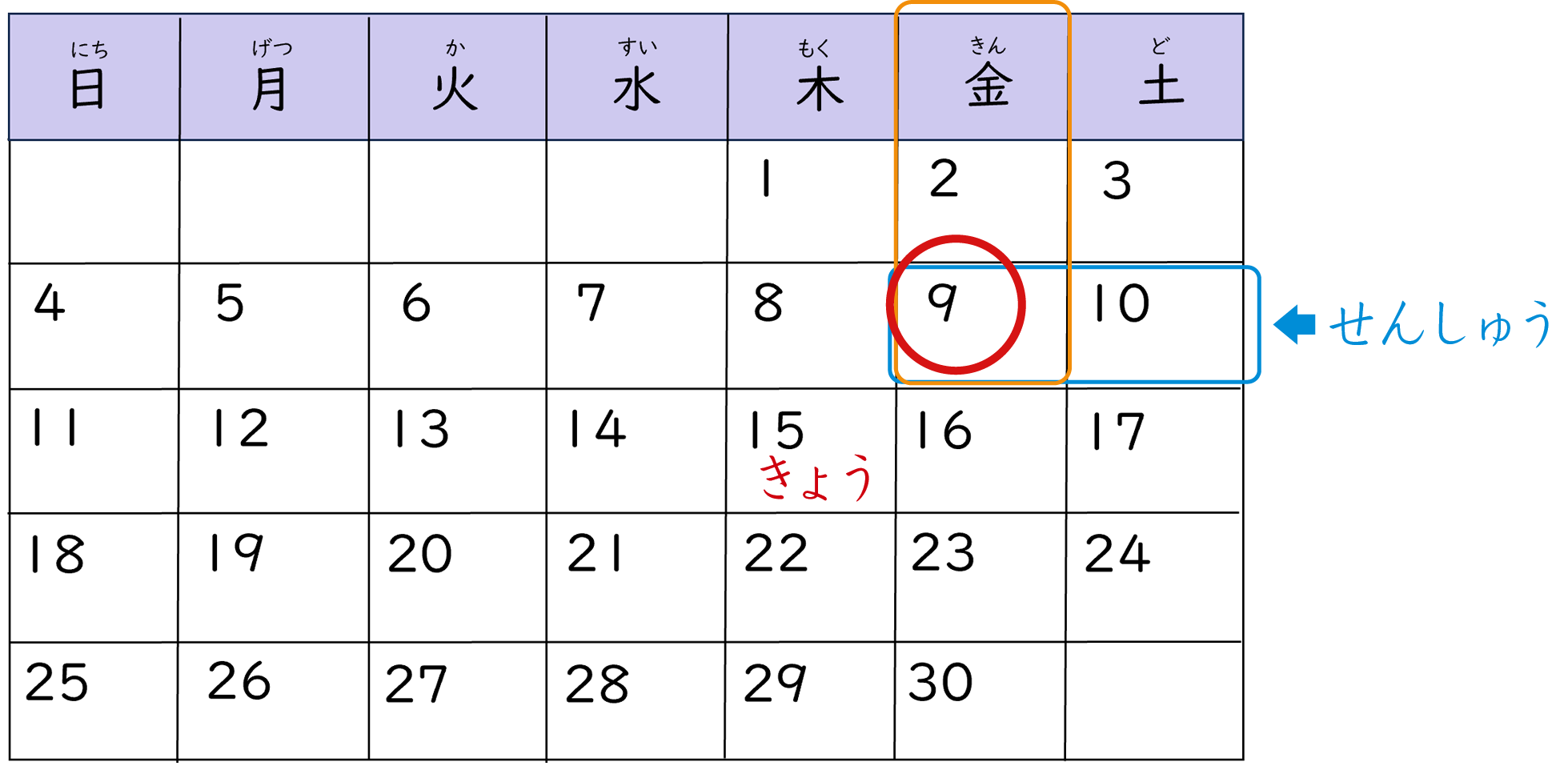 きょうは6がつ15にちです せんしゅうの きんようは なんにちか かこう