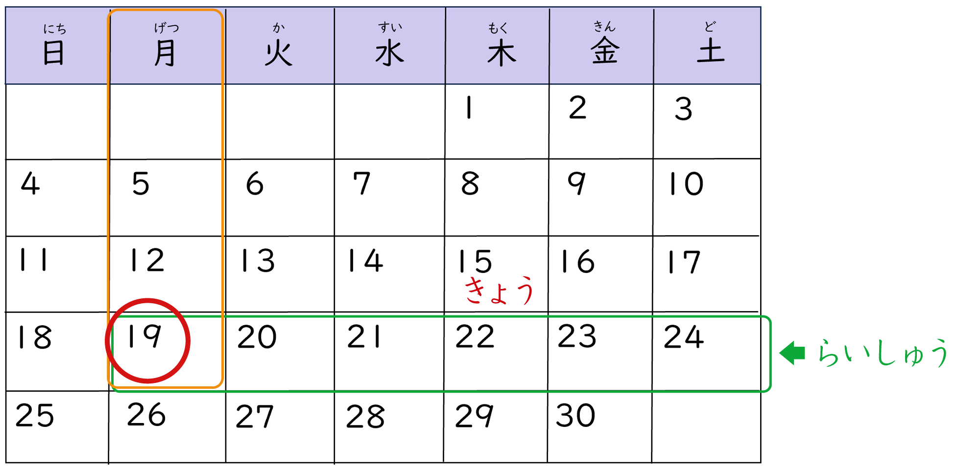 きょうは6がつ15にちです らいしゅうの げつようは なんにちか かこう
