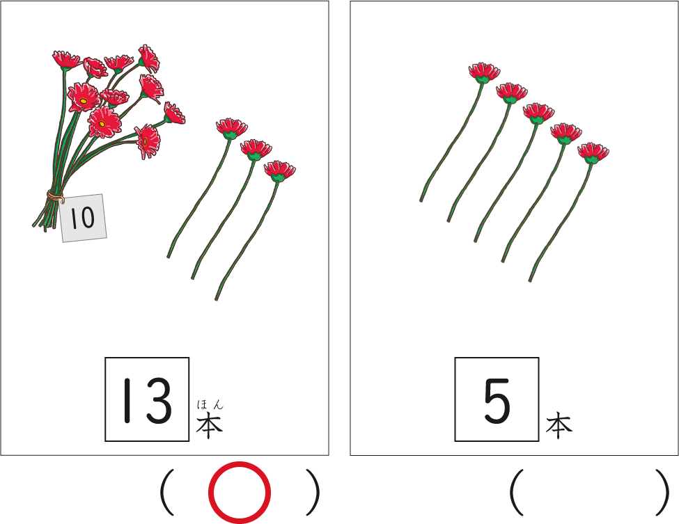はなのかずをかぞえて おおいほうに〇をつけよう