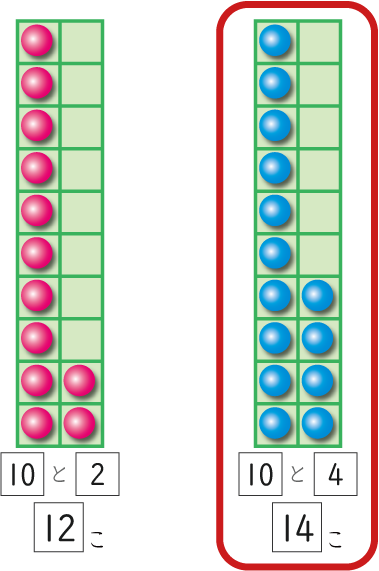 あかいたまは12(じゅうに)こ あおいたまは 14(じゅうよん)こ あおいたまのほうが おおいね