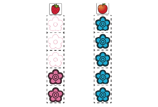 あかのおはじきを いちごの うえに おいてね。あおのおはじきは りんごの うえに おいてね。さいごに おはじきを したからおいて かずをくらべてみましょう。