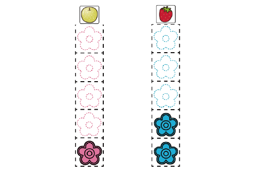 あかのおはじきを なしの うえに おいてね。あおのおはじきは いちごの うえに おいてね。さいごに おはじきを したからおいて かずをくらべてみましょう。