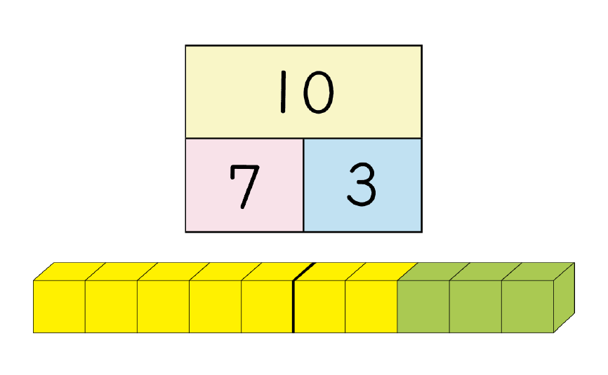 きいろが7、みどりが3、あわせて10だね。7と3で10。10は7と3。